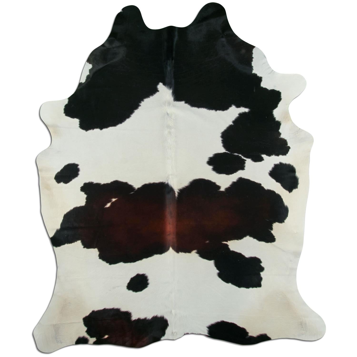 Dieses Fell kombiniert eine helle weiß-cremefarbene Grundfarbe mit schwarzen Flecken im oberen Bereich und einem braunen Mittelbereich. Die natürliche Fleckenstruktur sorgt für eine ausgewogene und dekorative Erscheinung.