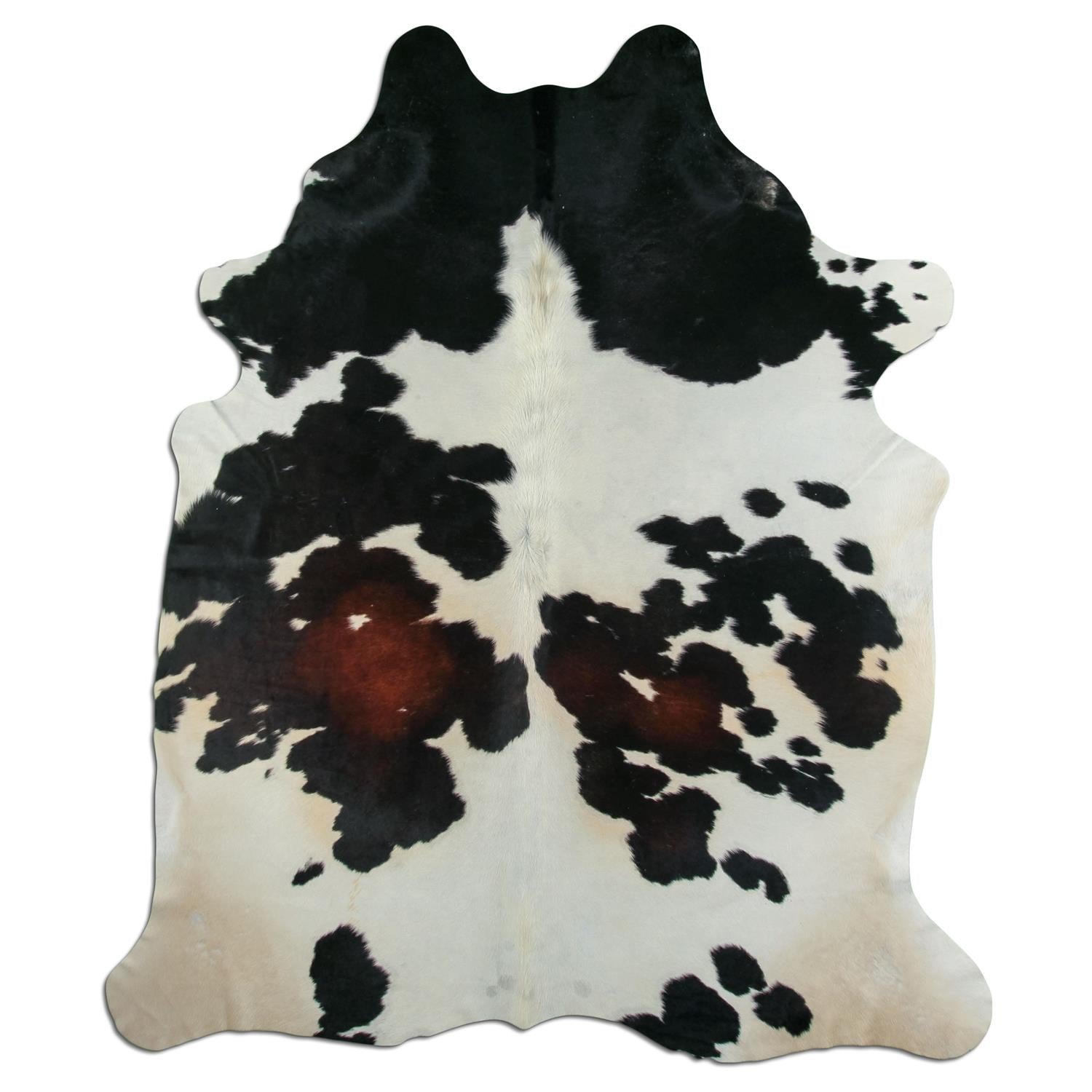 Dieses Fell zeigt eine weiße Grundfarbe mit schwarzen Flecken und einer braunen Zeichnung im unteren Bereich. Die natürliche Fleckenverteilung wirkt lebendig und verleiht dem Fell einen besonderen Charakter.