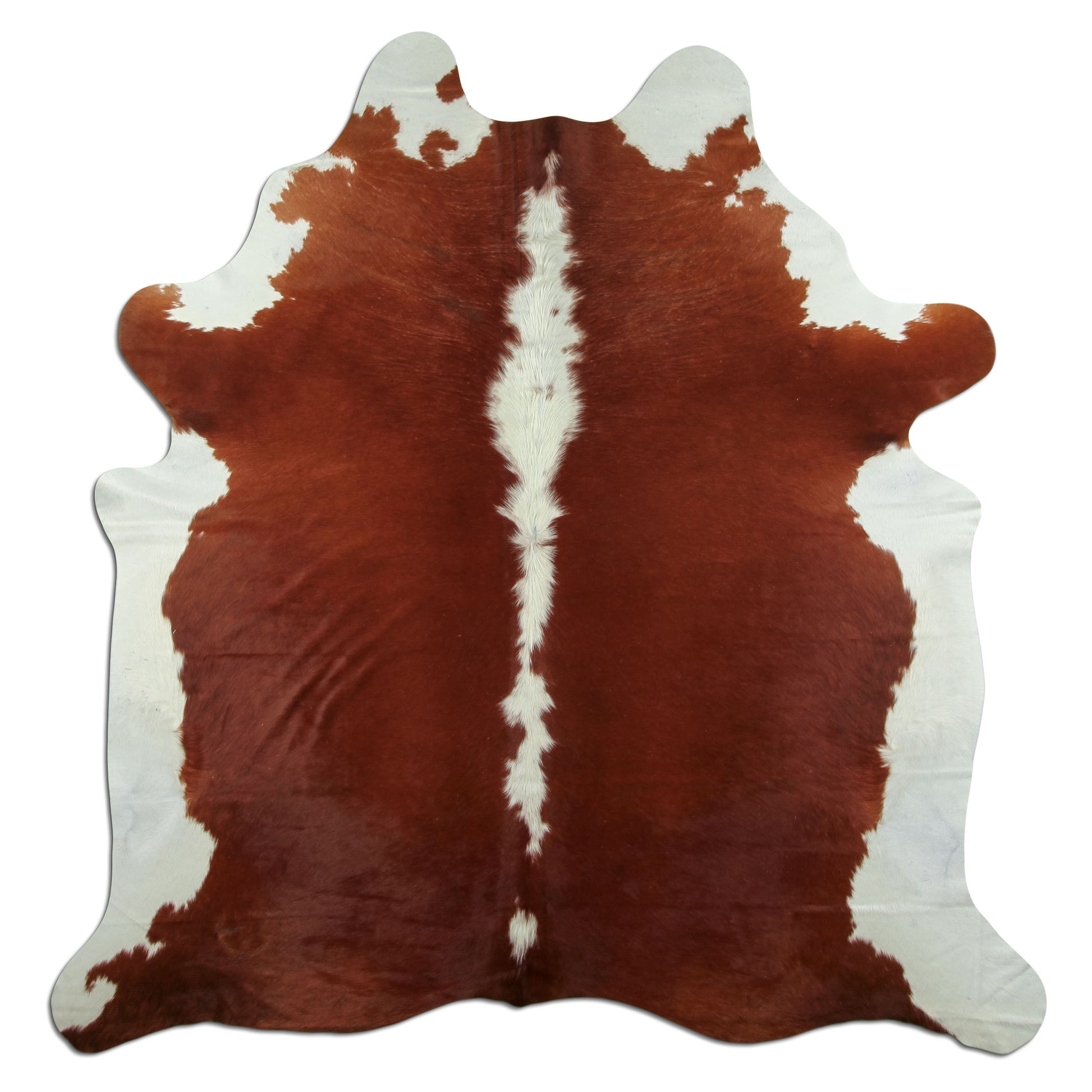 Dieses Fell hat eine intensive rotbraune Farbe mit einer klaren weißen Linie in der Mitte. Die Farbverteilung wirkt sehr ausgewogen und natürlich. Ideal für Räume, in denen ein warmes aber dennoch lebendiges Highlight gesetzt werden soll.